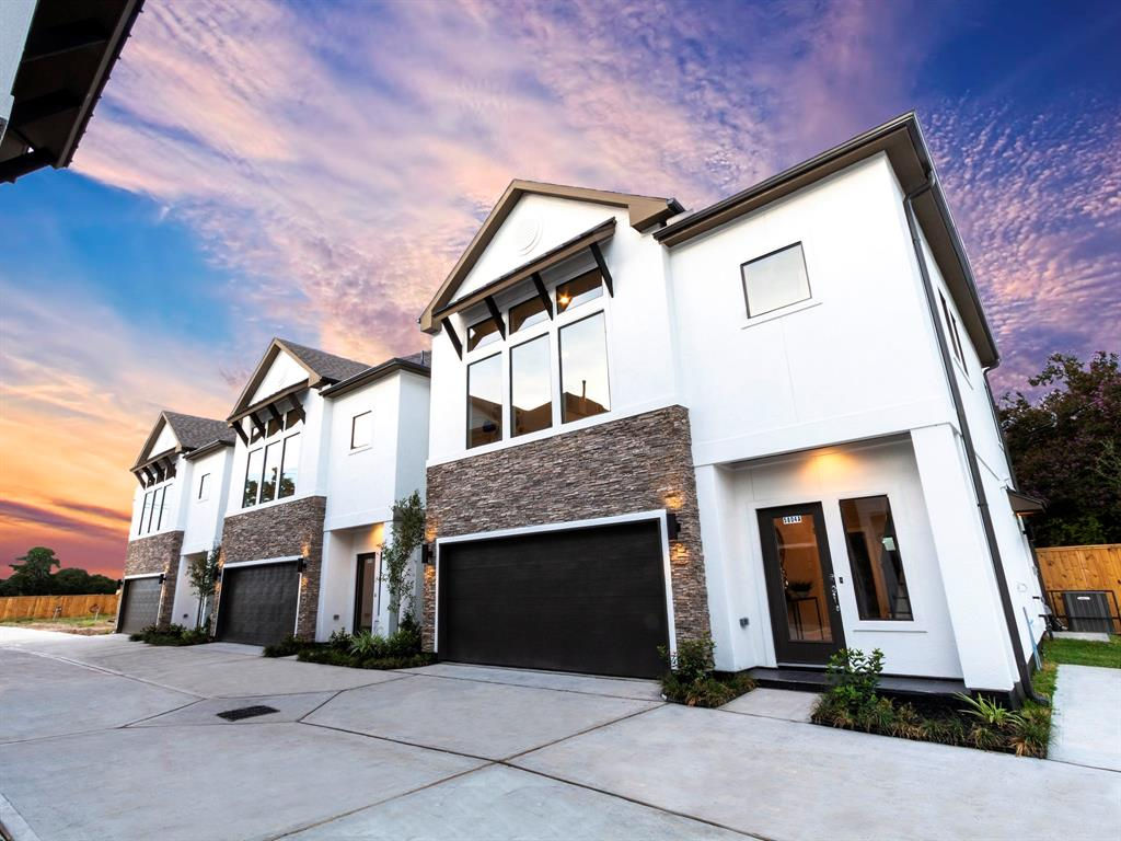 This project showcases architectural renderings of modern residential buildings with a car, and modern townhouses at twilight, highlighting unique architectural designs.